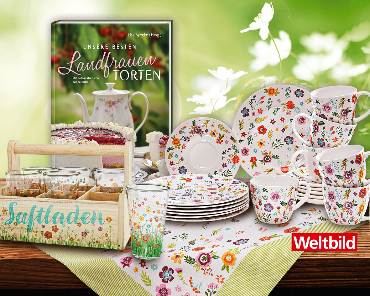Jetzt können Sie Ihre Sommerlaune mit einem tollen Gewinn extra in Schwung bringen: Zusammen mit der Weltbild-Filiale in Warendorf verlosen wir 2 x ein blumiges Genuss-Set. Darin enthalten ist jeweils ein 18-teiliges Kaffeeservice, das mit seinen bezaubernden Blümchendekor die Sonne im Herzen aufgehen lässt, dazu gibt es eine passende Mitteldecke und einen originellen „Saftladen“-Holzträger mit sechs sommerbunten Gläsern. Und damit auch gleich etwas Erfrischendes  auf den Kuchenteller kommt – wie wäre es zum Beispiel mit der Joghurttorte mit Heidelbeeren? – darf das Backbuch „Unsere besten Landfrauen-Torten“ mit köstlichen Rezepten natürlich nicht fehlen.