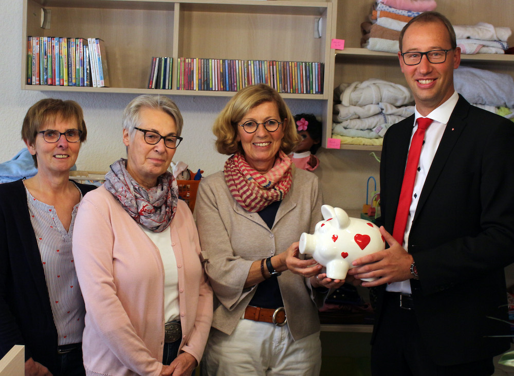 Freuen sich gemeinsam für den „Babykorb“ (v.l.): Susanne Blanke, Monika Wagner und Barbara Elpers bei der Spendenübergabe durch Andreas Wienker, Leiter der Hauptstelle Warendorf der Sparkasse Münsterland-Ost.
