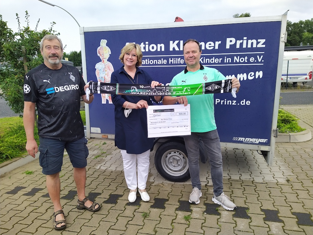 In einer spontanen Aktion – der Verlosung eines neuen Trikots – während der diesjährigen Mitgliederversammlung der „Warendorfer Fohlen“ kamen stattliche 445€ zusammen. Aus der Clubkasse des Fanclubs der Borussia Mönchengladbach wurde die Summe aufgerundet auf 500€ und ist nun der Aktion Kleiner Prinz für die Opfer der Hochwasserkatastrophe gespendet worden. Übergeben wurde die Spende von Christian „Edy“ Erpenbeck, dem Vorsitzenden des Fanclubs, und Dieter Faßold, dem Schriftführer. Sylvia Oertker, die Vorsitzende der Kinderhilfsorganisation, nahm das Geld dankend entgegen.