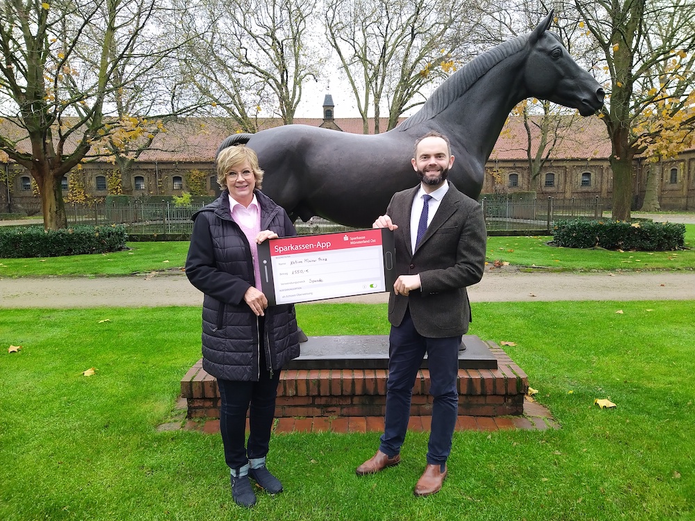 „Wir freuen uns, wieder einmal eine Spende, diesmal in Höhe von 1.550 €, an die Aktion Kleiner Prinz übergeben zu können!“ So Dr. Felix Austermann, der Leiter des NRW- Landgestüts in Warendorf. Sylvia Oertker, die Vorsitzende der Aktion Kleiner Prinz, war gekommen, um die Summe in Form eines symbolischen Schecks entgegenzunehmen. Durch eine Live-Verlosung während der letzten Hengstparade im September 2023 war diese zusammengekommen. Hauptpreise: Kutschfahrten über das Gelände des Landgestüts mit fachkundigen Erläuterungen zu Hengsten, Gebäuden und Anlagen. „Das hat den Gewinnern viel Freude gemacht“, erklärt Austermann, „und uns ebenfalls. Gerne informieren wir auch auf diese unterhaltsame und spannende Weise über unsere Arbeit und die Bedeutung unserer Hengste für die Pferdezucht in Westfalen und weit darüber hinaus. Und natürlich sind wir hier alle stolz nicht nur auf unsere Pferde, sondern auch auf unsere schöne historische Anlage, und wir zeigen sie gerne. Es hat sich viel getan in den letzten Jahren. So haben wir zum Beispiel eine neue Reithalle bekommen und Paddocks für die Hengste. Die Verlosung zu Gunsten der Aktion Kleiner Prinz werden wir auch bei der Hengstparade 2024 wieder anbieten. Sie hat schon Tradition und wird von den Besuchern der Hengstparaden gerne angenommen.“