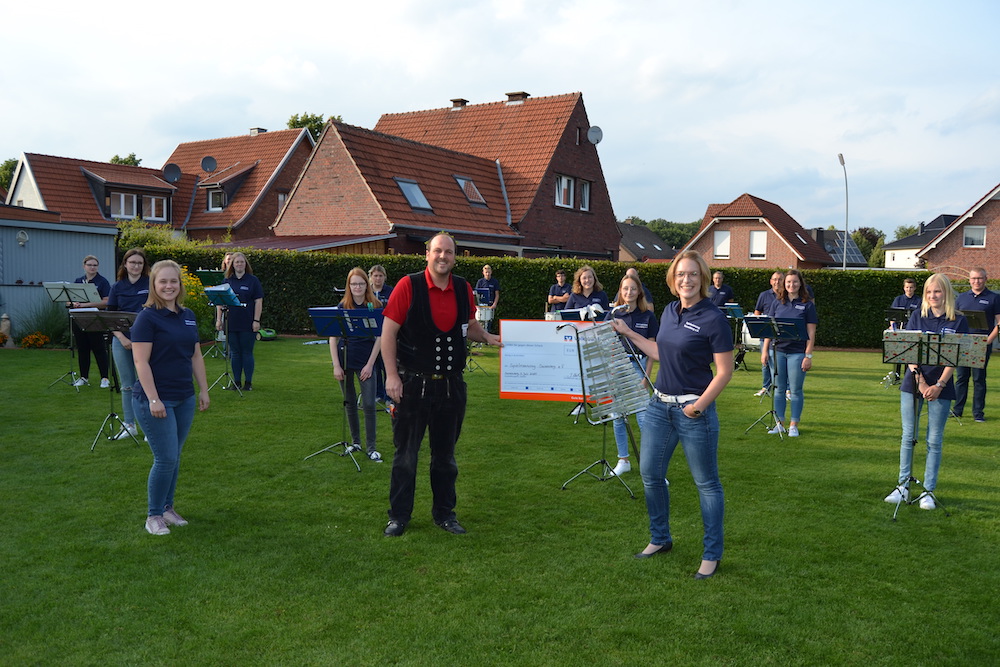 Dachdeckermeister Johannes Kortenbreer nutzte die Außenprobe vom Sassenberger Spielmannszug, um den Musikern einen Spendenscheck zu überreichen. Der Verein freut sich über die großzügige Spende, denn die fehlenden Einnahmen der Spielsaison 2020 haben den Verantwortlichen Sorgen bereitet.