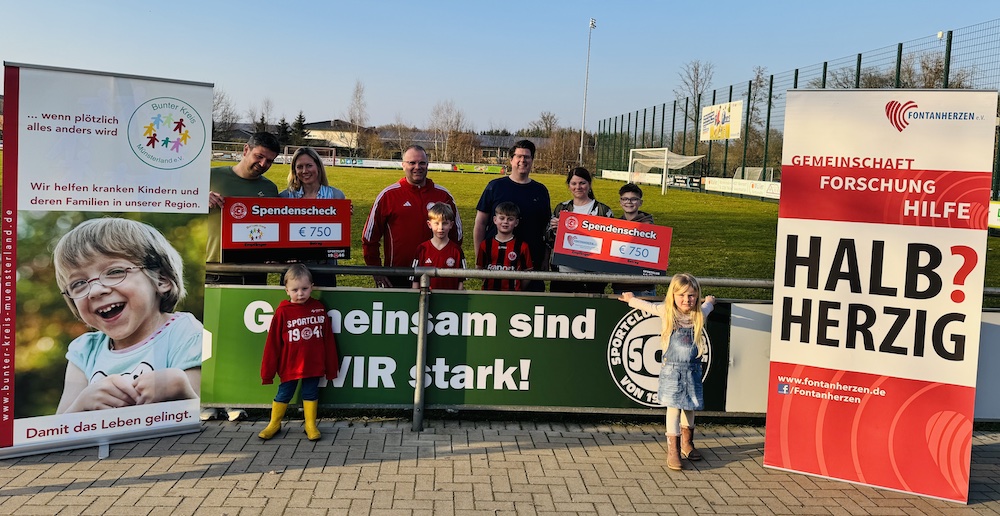 Bereits zum dritten Mal stand in Füchtorf wieder ein ganzes Wochenende im Zeichen des Jugendfußballs. Vom 17. bis 19.01.2025 kämpften sechs- bis zwölfjährige um die begehrten Pokale und Medaillen, auch wie im letzen Jahr wieder gesponsert von der Sparkasse Münsterland Ost. Bereits zum zweiten Mal unterstütze die Firma Feinkost Nagel die Jugendfussballabteilung und stellte der von den Eltern organisierten Cafeteria Brezeln, Würstchen und vieles mehr zur Verfügung. Auch die Familien der Kickerinnen und Kicker brachten sich u. a. mit selbstgebackenen Kuchen und Waffelteig ein, so dass am Ende des Turniers eine stolze Summe gespendet werden konnte. Jeweils 750 Euro erhielten wie auch im Vorjahr der Bunte Kreis und Fontanherzen. Beide Organisationen setzen sich für Kinder ein. Stellvertretend nahmen Johan Ostholt und Femke Ringemann die Spendenschecks vom Jugendobmann des SC Füchtorf, Daniel Kuhlmann, in Empfang. Beide Kinder wurden von den Organisationen unterstützt und sind im SC aktiv, die Väter der Kinder sind der SC Jugendabteilung eine große Stütze, als Vorstandsmitglied bzw. als Trainer.