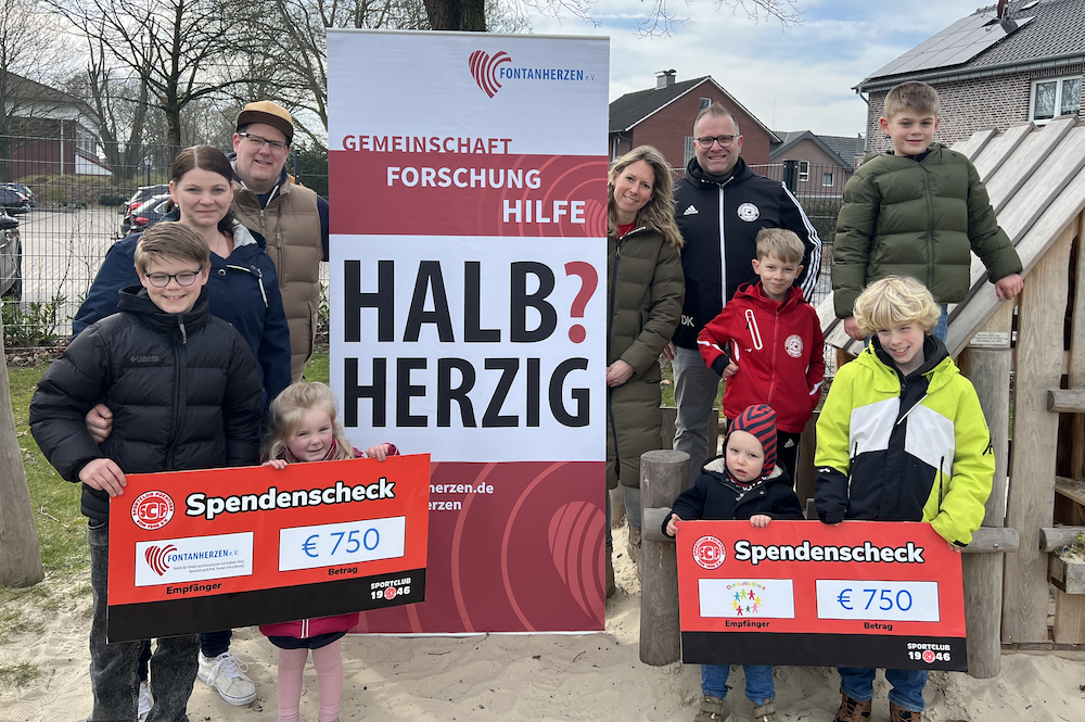 Vom 19.01.2024 bis 21.01.2024 richtete die Fußballjugendabteilung des SC Füchtorf bereits zum zweiten Mal Fussballhallenturniere der einzelnen Jugendfussballmannschaften aus. Um das leibliche Wohl der Teilnehmerinnen und Teilnehmer und der vielen Gäste kümmerten sich an dem Wochenende die Eltern der Kickerinnen und Kicker. Der Erlös der Cafeteria wurde nun an zwei Organisationen, die sich für benachteiligte Kinder einsetzen, gespendet. Über jeweils 750 Euro dürfen sich nun der Bunte Kreis und der Verein Fontanherzen e.v. freuen. Stellvertretend für die beiden Organisationen nahmen heute Familie Ringemann und Familie Ostholt/ Peyrick die Spendenschecks entgegen. Beide Familien wurden von den Organisationen wegen ihrer Kinder Femke und Johan unterstützt. Der Jugendabteilung des SC ist es laut Jugendobmann Daniel Kuhlmann wichtig, dass die Spenden an Organisationen gehen, die sich für Kinder einbringen. Da mit Femke und Johan Kinder betroffen sind, bei denen die Familien beim SC engagiert sind, fiel die Wahl auf diese. Der SC freut sich die tolle Arbeit unterstützen zu können.