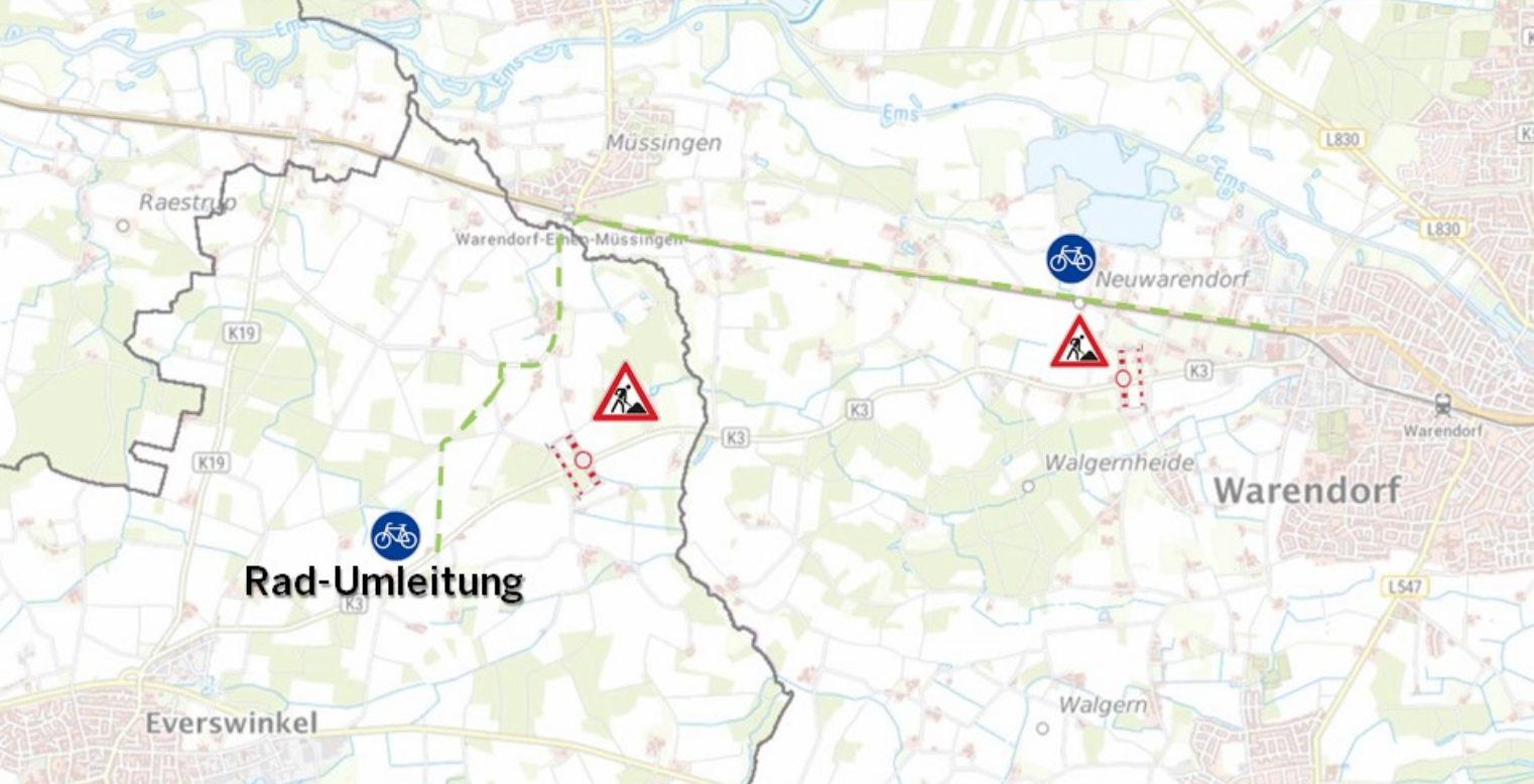 Am Montag, 22. Dezember wird die Sperrung der K3 zwischen Warendorf und Everswinkel im Laufe des Tages aufgehoben. Der Radweg bleibt bis ins Frühjahr weiter gesperrt. Die Fahrrad-Umleitung bleibt bestehen.“