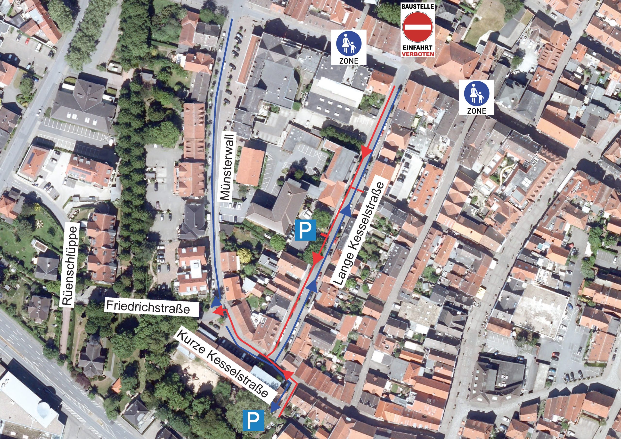 Aufgrund der dadurch entstehenden Sackgassensituation im Kreuzungsbereich Münsterstraße/ Lange Kesselstraße/ Hohe Straße wird der Verkehr aus der Kurzen Keselstraße und der Langen Kesselstraße (z. B. von den Parkplätzen am Verwaltungsgebäude und der Stadtbücherei) über die Friedrichstraße und Rüenschlüppe umgeleitet.