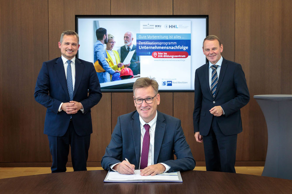 Münster/Leipzig. – Der Grundstein für ein in Deutschland bislang einzigartiges Weiterbildungsangebot für Unternehmensnachfolger ist heute (6. Oktober) in Münster gelegt worden. Die Rektoren der Handelshochschule Leipzig (HHL), Prof. Dr. Stephan Stubner, und der Westfälischen Wilhelms-Universität Münster (WWU), Prof. Dr. Johannes Wessels, unterzeichneten im Bildungszentrum der IHK Nord Westfalen einen Kooperationsvertrag für das Zertifikatsprogramm „Unternehmensnachfolge“ mit dem Untertitel: „Zielgerichtetes Nachfolgemanagement in Zeiten der digitalen Transformation“. Ziel des neuen Angebotes, das von der IHK Nord Westfalen initiiert wurde, ist es, Nachfolgerinnen und Nachfolger auf den anstehenden Stabwechsel im Unternehmen vorzubereiten und ihnen gleichzeitig das Rüstzeug für die digitale Transformation ihrer Unternehmen zu vermitteln.