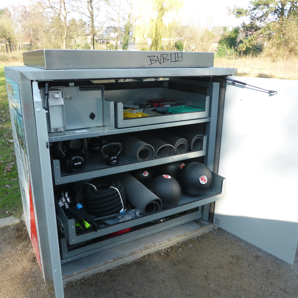 Mit einer einmaligen Anmeldung in der App „App and move“ kann zu einem vorangemeldeten Zeitraum (1 Stunde) die Box geöffnet und die Geräte kostenfrei zum Training entnommen werden.