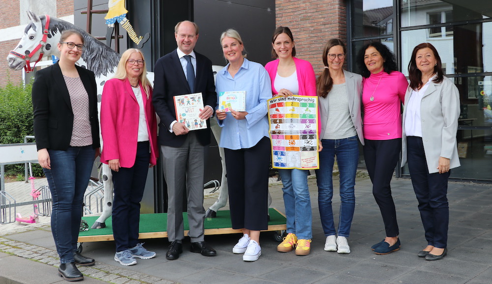 Freuen sich über 15 Jahre Sprachförderung nach dem Modell Mercator im Kreis Warendorf: (v.l.) Silvia Vogelsang, Dr. Sabina Schroeter-Brauss (beide Uni Münster), Landrat Dr. Olaf Gericke, Schulleiterin Antje Dünnewald, Mette Fenja Woidtke (eingesetzt an der Astrid-Lindgren-Schule im Mercator-Modell), Anke Frölich (Leiterin Amt für Jugend und Bildung), Dr. Durdu Calikbasi und Diler Senol-Kocaman (beide Kommunales Integrationszentrum). – Foto: Kreis Warendorf
