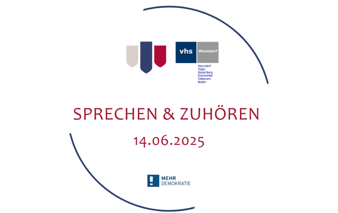 Entwickelt wurde das Format „Sprechen & Zuhören“ von Mehr Demokratie e. V. Mittlerweile werden deutschlandweit Veranstaltungen durchgeführt. Den Anstoß, das Dialogformat auch nach Warendorf zu bringen, gab das Bürgerforum. Mit der VHS konnte dabei ein wertvoller Partner gewonnen werden.