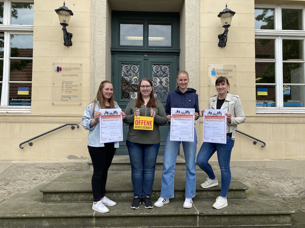 Als Büchereileiterin Birgit Lücke und Lisa Woitschikowski, Medienpädagogin in der Bücherei, die Mail von Sarah Hagedorn, Melina Kortmann und Elisa Rickert lasen, mussten sie nicht lange für eine Antwort überlegen. Die drei Studentinnen des Studiengangs „Bibliothek und digitale Kommunikation“ an der Technischen Hochschule Köln schlugen vor, gemeinsam mit der Stadtbücherei Warendorf eine Living Library zum Thema Barrierefreiheit und Inklusion zu organisieren und durchzuführen. Was für die drei Studentinnen ein Projekt im Rahmen einer Lehrveranstaltung ist, ist für die Stadtbücherei eine tolle Gelegenheit, ihr Angebot „Bücherei als Dritter Ort“ weiter auszubauen.