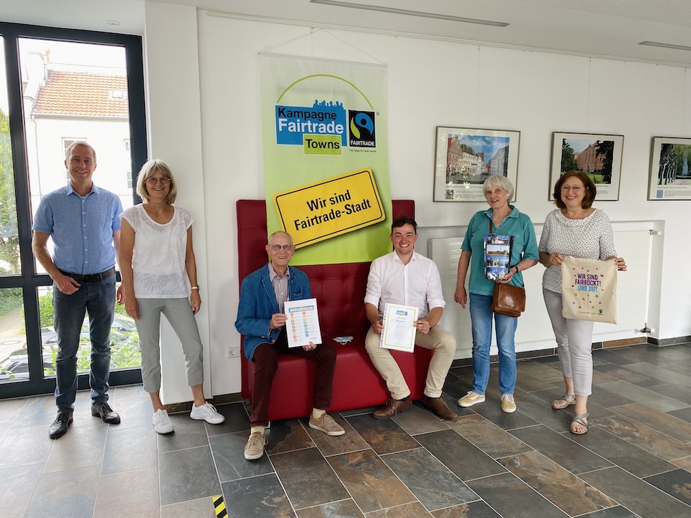 Mit einer schönen Botschaft im Gepäck besuchten die Mitglieder der Warendorfer Fairtrade-Steuerungsgruppe jetzt Bürgermeister Peter Horstmann: Warendorf darf sich zwei weitere Jahre „Fairtrade-Stadt“ nennen. Die entsprechende Urkunde übergab Antonius Stuke als Leiter der Steuerungsgruppe an Bürgermeister Peter Horstmann.