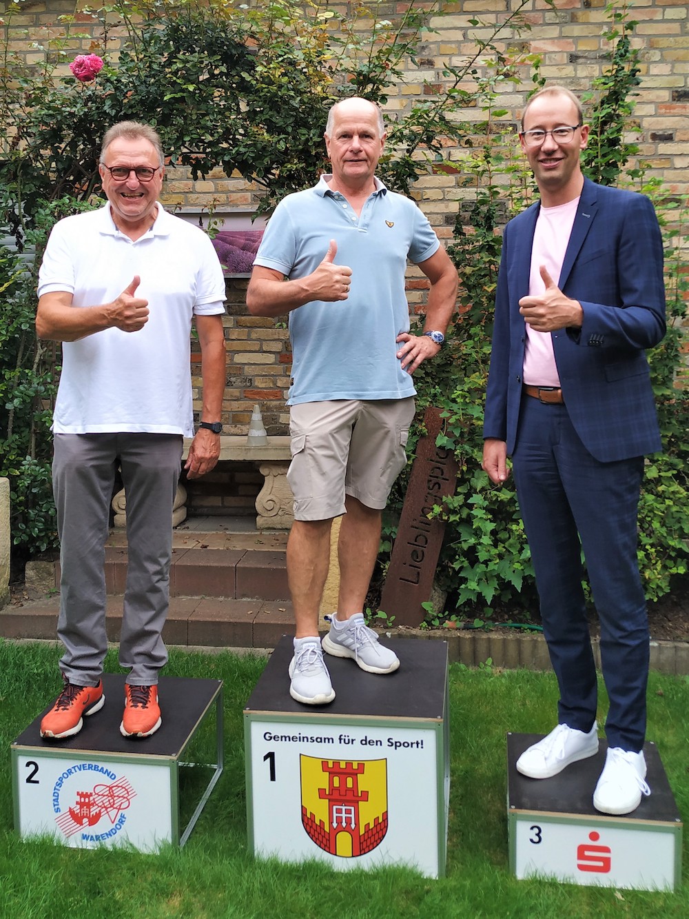 Der Stadtsportverband stellt ein Siegerpodest für Sportveranstaltungen seiner Mitgliedsvereine zur Verfügung. Darüber freuen sich von links Peter Huerkamp (1. Vorsitzender SSV), Hermann-Josef Becker (Geschäftsführer SSV) und Andreas Wienker (Regionalmarktleiter der Sparkasse Münsterland Ost für Warendorf-Beelen-Everswinkel-Sassenberg).