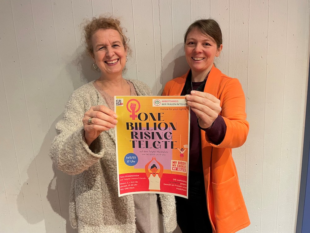 Im Rahmen der Aktion One Billion Rising versammeln sich Menschen auf der ganzen Welt, um gemeinsam ein starkes Zeichen der Solidarität und des Widerstands zu setzen. In diesem Jahr findet die Tanzdemonstration als Zeichen gegen Gewalt an Frauen und Mädchen erstmals auch in Telgte statt. Der Arbeitskreis „Wir Frauen in Telgte“ organisiert das erste Rising am 14. Februar. Dann wird der Marktplatz in Telgte zum Zentrum für einen Tanzflashmob.