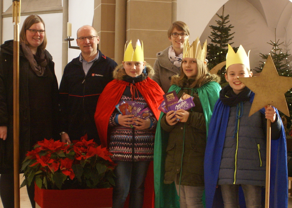 Am vergangenen Wochenende waren 90 Sternsinger in St. Jakobus in Ennigerloh unterweges, um die Häuser mit dem Spruch „20+C+M+B+18“ zu segnen. Gleichzeitig baten sie um Spenden für Kinder in Indien und Kolumbien. Neben den Geldspenden erhielten sie von den Besuchten auch wieder Süßigkeiten geschenkt. Hiervon haben die Sternsinger wieder viele Tafeln Schokolade an die Warendorfer Malteser für die benachteiligten Kinder in Baia Mare in Rumänien und Fushë-Arrëz in Albanien übergeben. Nach dem Abschlussgottesdienst überreichten die kleinen Könige die Süßigkeitenspende an Wolfgang Seck von den Warendorfer Maltesern. „Wir freuen uns, mit dieser Spende den Kindern in Baia Mare und Fushë-Arrëz eine kleine Freude zu machen“, so Pastoralassistentin Vera Naber. Die Naschereien werden die Malteser auf ihren nächsten Transporten mitnehmen und an die Kinder verteilen. „Im Namen der Kinder in Rumänien und Albanien danken wir euch für die süße Unterstützung“, so Wolfgang Seck bei der Übergabe der Schokolade. Weitere Informationen zur Auslandsarbeit der Warendorfer Malteser gibt es unter www.malteser-warendorf.de.