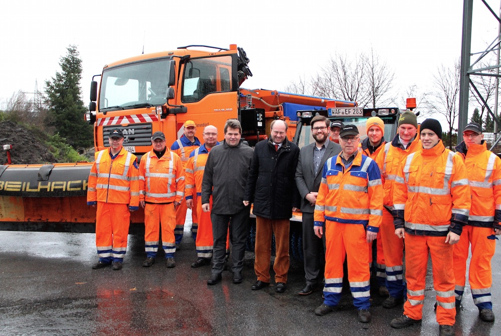Unser Foto zeigt: Für Winterdiensteinsätze auf den Kreisstraßen sind die Straßenwärter des Kreises Warendorf gewappnet. Davon überzeugte sich Landrat Dr. Olaf Gericke (6.v.l.) auf dem Kreisbauhof in Warendorf und dankte den Mitarbeitern für ihren Einsatz. Mit im Bild: Umwelt- und Baudezernent Carsten Rehers (5.v.l.), der Leiter des Amtes für Umweltschutz, André Hackelbusch (7.v.l.) im Gespräch mit Hermann Alsmann (5.v.r.), Leiter des Kreisbauhofes in Warendorf. – (Foto: Kreis Warendorf).