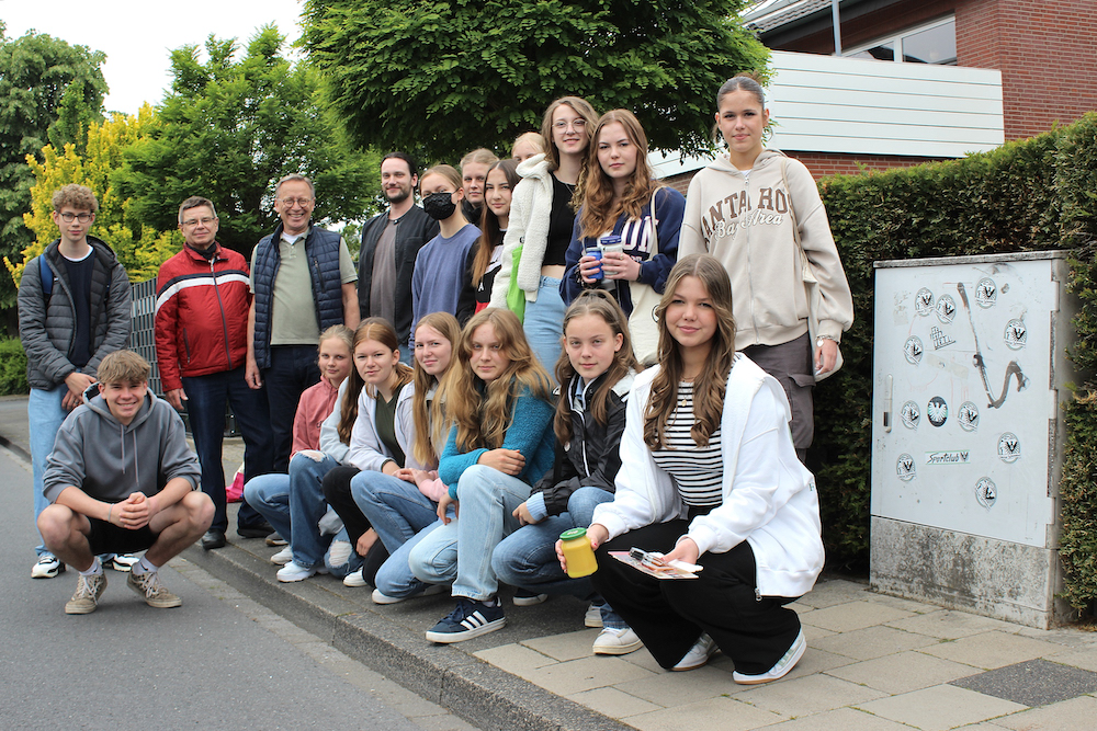 Farbe auf graue Verteilerkästen brachten unter anderem die Schülerinnen Nele Paschel und Alina Schroer (von links), hier zusammen Werner Schweck, dem Organisator des Projektes, zu sehen.