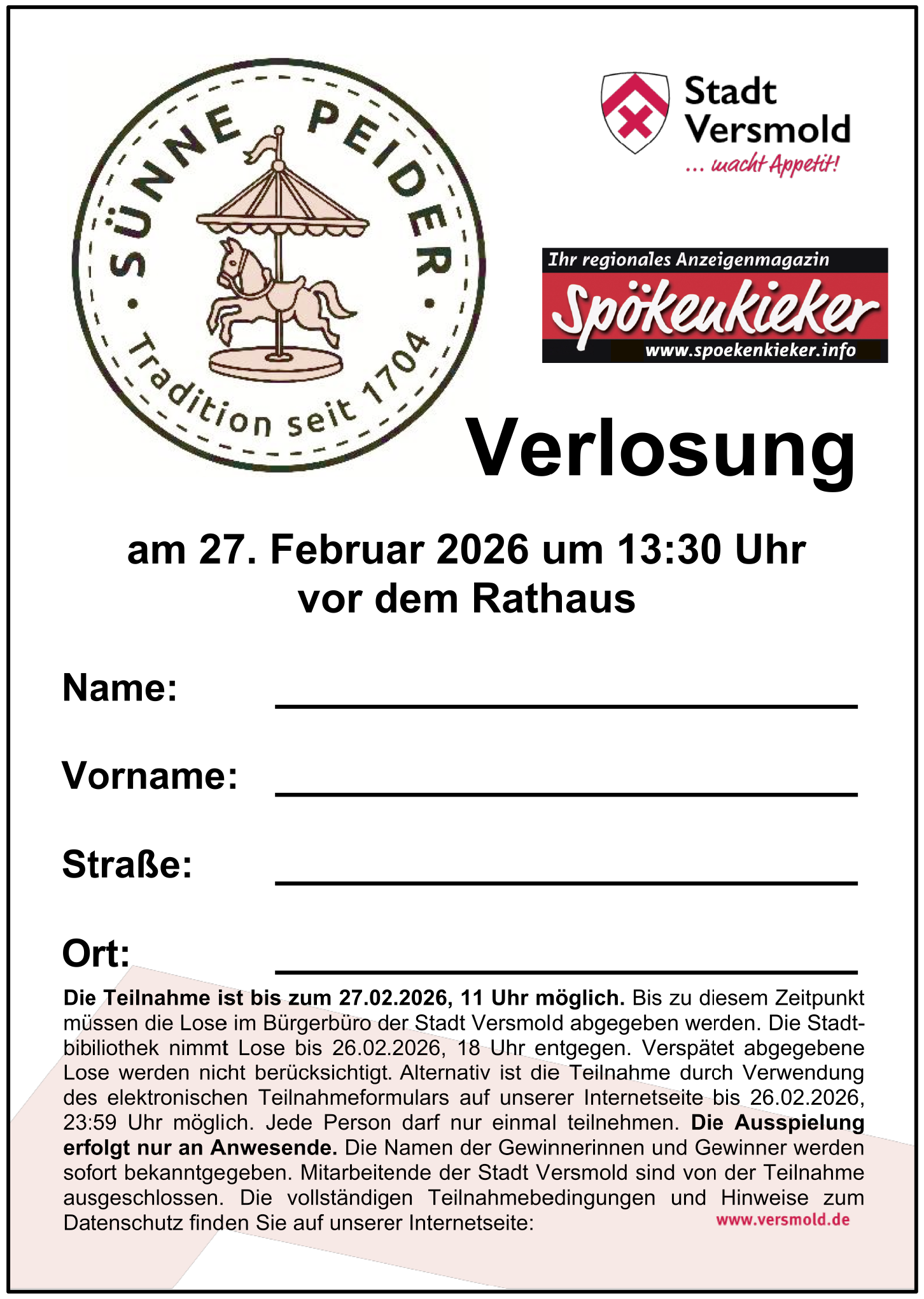 Der offizielle Startschuss fällt am Freitag, 27. Februar, um 13:30 Uhr. Bürgermeister Michael Meyer-Hermann wird gemeinsam mit der Landrätin des Kreises Gütersloh, Ina Laukötter, sowie den Schaustellerinnen und Schaustellern die Kirmes eröffnen. Begleitet wird die Eröffnungsfeier vom Musikzug der Freiwilligen Feuerwehr Versmold sowie den Tanzgruppen der SG Oesterweg und der TG Bockhorst. Im Rahmen der Eröffnung dürfen sich die Besucherinnen und Besucher auch wieder auf einen Freikartenregen freuen. „Nach den guten Erfahrungen mit Freikarten-Chips im vergangenen Jahr, werden wir dies in diesem Jahr fortsetzen“, erklärt Fachbereichs- und Marktleiter Sven Rabaschus. Außerdem werden attraktive Wertgutscheine für Reisen von Sieckendiek verlost: 700 Euro für den ersten Platz, 500 Euro für den zweiten und 300 Euro für den dritten Platz.Die Gewinnerinnen und Gewinner müssen bei der Ziehung anwesend sein.