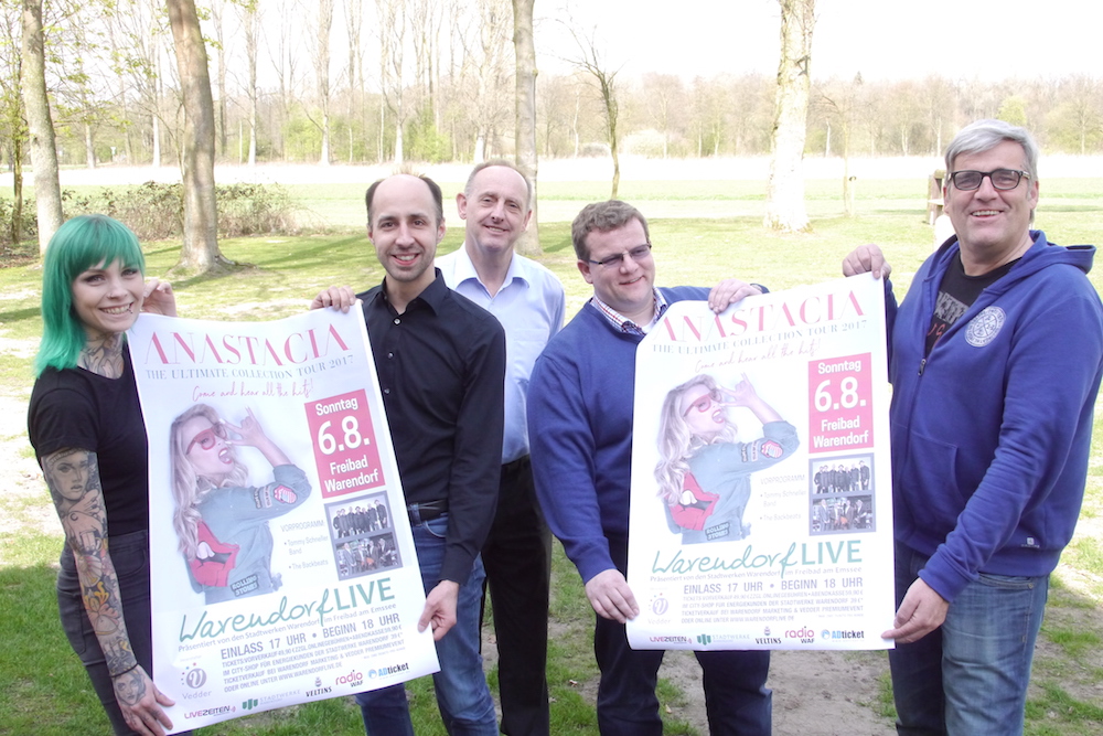 Am 6. August gibt es die Chance, diese Hits, zahlreiche mehr, sowie Songs aus ihrem neuesten Album „Ultimate Collection“ live zu hören. Dort wo bereits im Vorjahr NENA auf der Bühne stand: Im Warendorfer Freibad bei „Warendorf Live 2017“. Ein echt großer Wurf, der Veranstalter Markus Vedder von „Vedder Premium Events Westkirchen“ in Kooperation mit „Livezeiten Musikmarketing“, Warendorf Marketing und den Stadtwerken Warendorf da gelungen ist. Ein amerikanischer Superstar, durch ihre Stimmgewalt bereits jetzt eine Pop-Legende in Warendorf. „Macht Spaß so was zu machen“, lacht Vedder und Andre Auer vom Stadtmarketing schmunzelt: „Erst Christina Stürmer, dann NENA, jetzt Anastacia – wer hat da noch mal gesagt, Warendorf sei eine Rentnerstadt?“