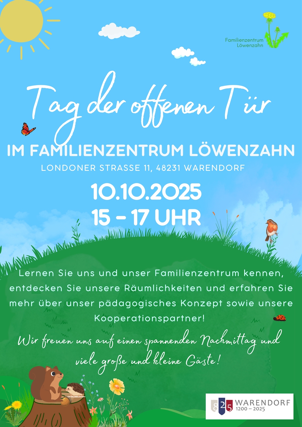 Am kommenden Freitag, 10.10.25 ist Tag der offenen Tür im Familienzentrum Löwenzahn in Warendorf.