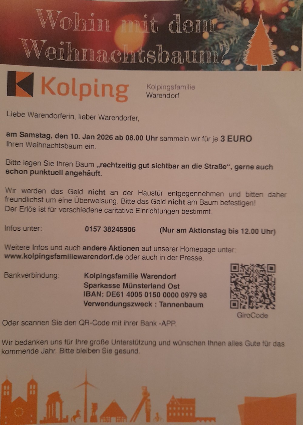 Geplant wird derzeit die Durchführung der Tannenbaumsammlung der Kolpingsfamilie Warendorf. Diese soll am 10. Januar 2026 stattfinden.