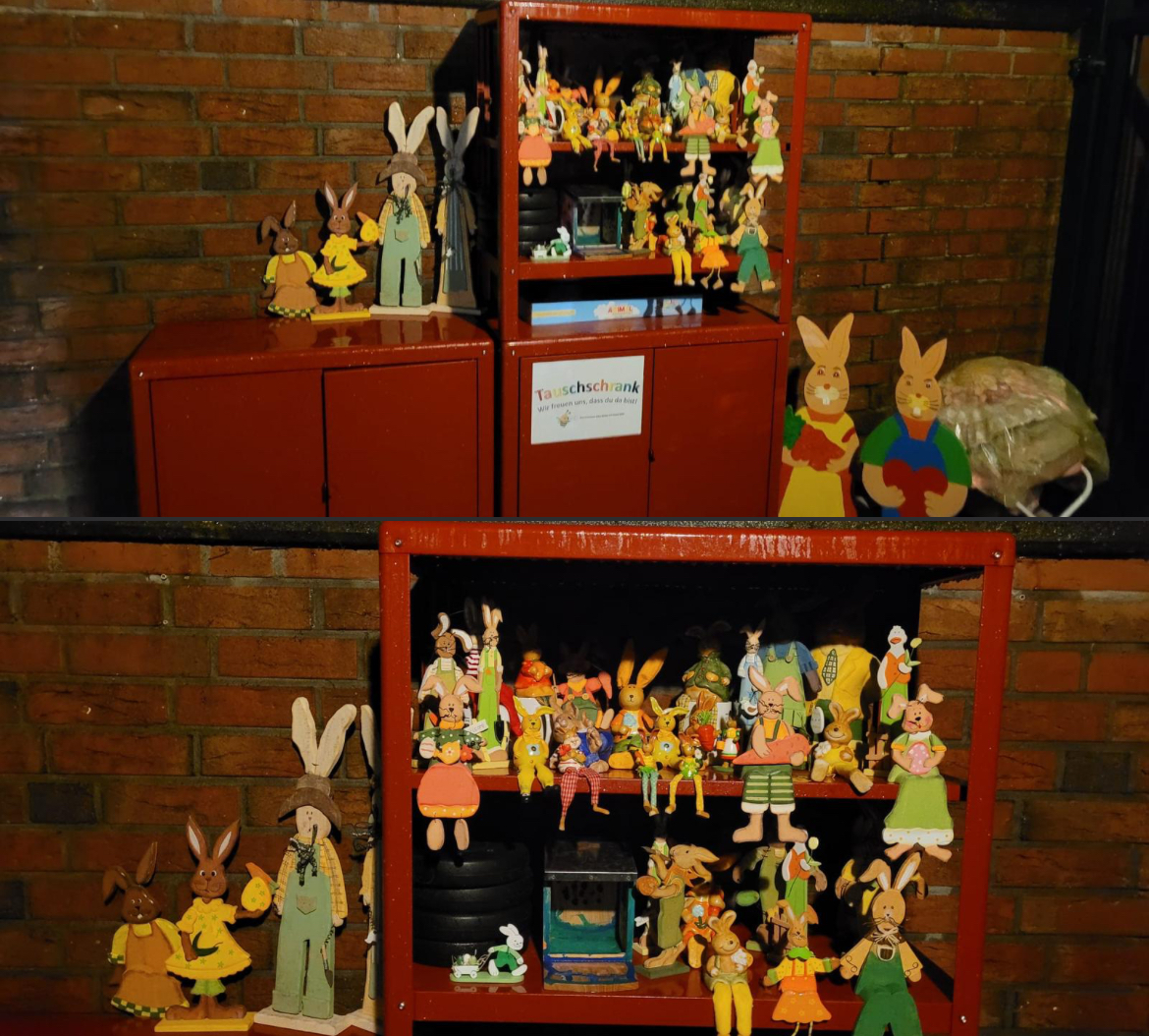 Und es gibt viele herrliche Beispiele für die Nutzung, so hat im Frühjahr jemand seinen ganzen „Hasenbestand“ in den Tauschschrank gestellt und dieser fand innerhalb kürzester Zeit neue Besitzer. Das freut die Mitarbeiter: Innen des Familienzentrums sehr und bestärkt das Team dieses gute Angebot weiter zu gestalten.