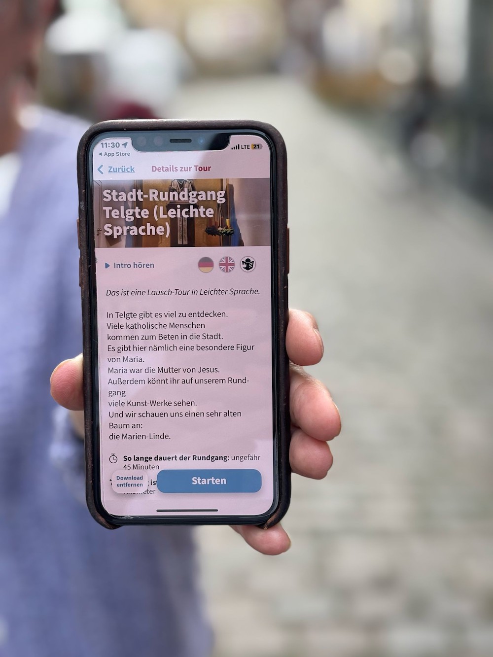 Das Team von Tourismus + Kultur hat in Zusammenarbeit mit dem Anbieter „Lauschtour“ eine Telgte-Tour für das Smartphone entwickelt. Sie beginnt am Marktplatz und führt auf einer ca. 1,2 km langen Strecke zu den Sehenswürdigkeiten in Telgte. Entlang einem Teil der bekannten Kulturspur können die Nutzer*innen der Lauschtour-App Geschichten rund um Marktplatz, Kirche und RELíGIO hören. Neben den Versionen in englischer Sprache und für Menschen mit einer Hörbeeinträchtigung (zum Mitlesen), gibt es die Stadtführung nun auch in leichter Sprache.