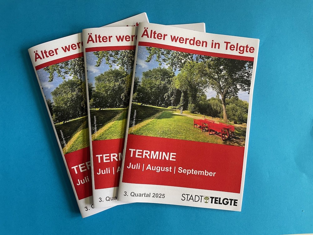 Die neue Broschüre „Älter werden in Telgte“ ist erschienen. Sie liegt ab sofort im Rathaus, Treffpunkt und an verschiedenen Stellen in Telgte und Westbevern aus. Darin finden Seniorinnen und Senioren wichtige Adressen, Telefonnummern und Termine von Vorträgen, Veranstaltungen und anderen Angeboten in den Monaten Juli, August und September speziell für ältere Menschen in Telgte.