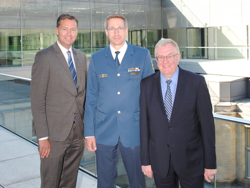 Unser Foto zeigt: (v.l.) Stephan Mayer MdB (Präsident der THW‐Bundesvereinigung), Reinhold Sendker MdB und Ralf Pelkmann (THW Beckum)