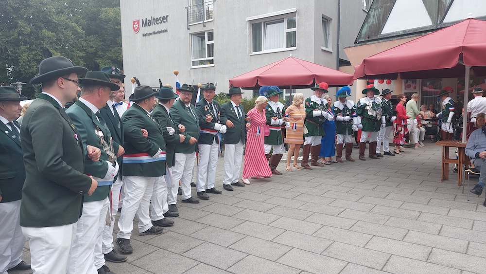 Am Sontag besuchte die Schützengarde 83 des Bürgerschützenvereins Warendorf traditionsgemäß, im Rahmen des Bürgerschützenfestes, dass Malteser Marienheim, um den Bewohnern das Schützenfest wieder ein Stück näher zu bringen. Begleitet wurde die Schützengarde von dem Königspaar Stefan und Tanja Göhler mit ihrer Throngesellschaft, sowie den Fahnenschlägern und dem Spielmannszug Freckenhorst. Natürlich durfte auch das Warendorfer Urgestein Franz Schulze Nahrup mit seinem Akkordeon nicht fehlen. Wie seit langem wurden auch dieses Jahr wieder rote Rosen an die Bewohner verteilt. Nach einem abwechslungsreichen Programm mit Fahnenschlag, Gesang und Schunkeln gab es Applaus und zur Stärkung Kaltgetränke und einen Malteser. Diese Tradition ist ein wichtiger Programmpunkt der Schützengarde und bereitet sowohl den Bewohnern des Marienheims als auch den Schützen viel Freude.