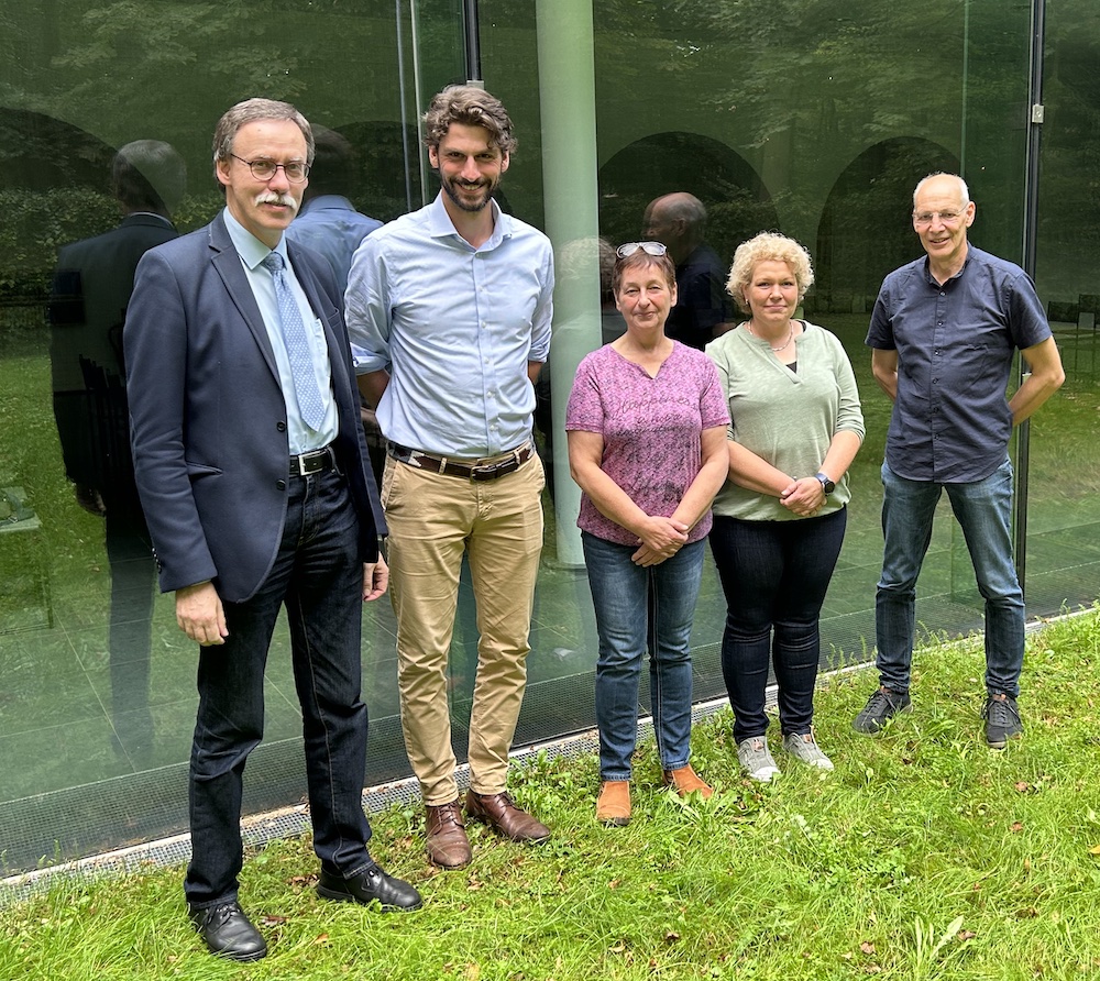 Zur Vorstellung der Möglichkeiten von Trauerfeierlichkeiten in der LVHS trafen sich vor der LVHS-Kapelle (von links nach rechts) LVHS-Direktor Michael Gennert, Waldbesitzer Nikolaus Graf von Westerholt sowie das Team vom FriedWald Münsterland Manuela Ben Tabet, Kerstin Grunau und Martin Kofoth.