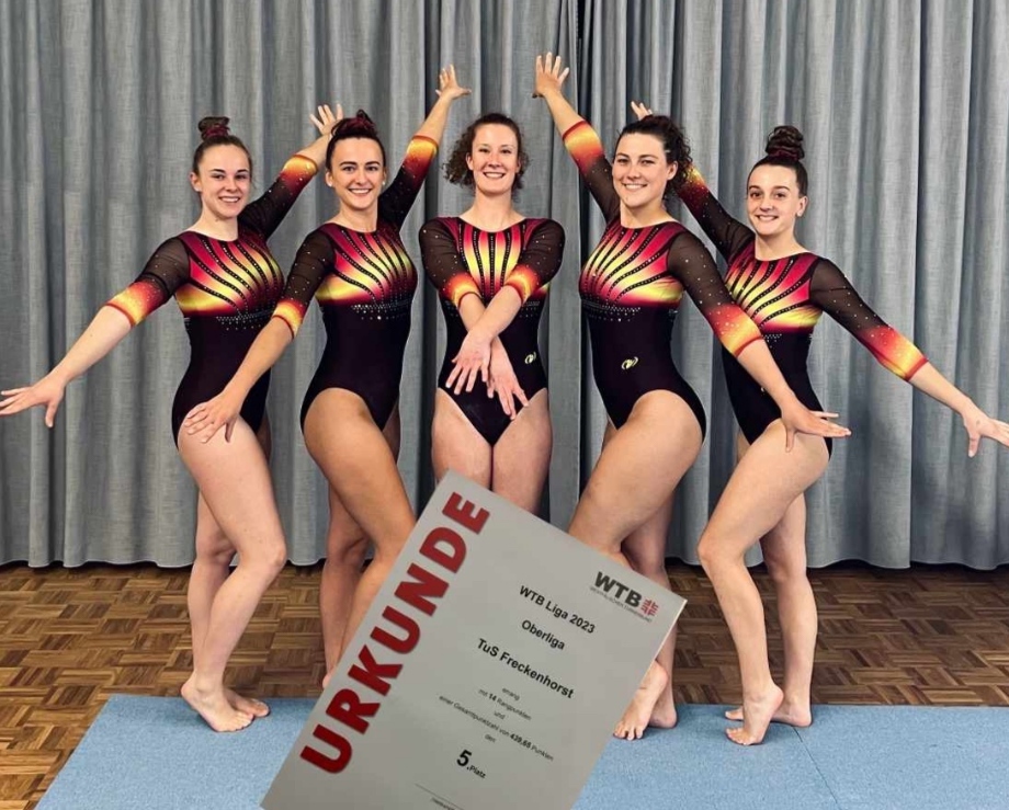 Am Samstag, den 21.10.2023 wurde in Greven der 3. Wettkampf der diesjährigen Oberliga-Saison im Kunstturnen ausgetragen. In der höchsten Wettkampfklasse des Westfälischen Turnerbundes stellten sich Sophia Beerenbrink, Saskia Hopfe, Marie Böckenkötter, Valerie Hövener und Greta Alsmann (Foto v.l.n.r.) den sieben Konkurrenzmannschaften. Da in diesem Jahr erstmalig kein Relegationswettkampf geturnt wird und damit die letzten beiden Mannschaften automatisch absteigen, war die Spannung besonders groß. Nach Rang 8 am ersten und Rang 6 am zweiten Wettkampftag war das Finale für die Freckenhorsterinnen besonders spannend.