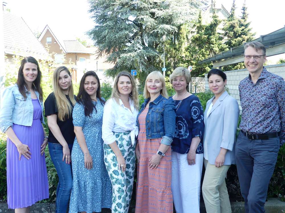 Projektkoordinatorin Sarah Kersting (v. l.), Maryna Rodko, Larysa Vovnianko, Iryna Mahlatii, Yuliia Beirysh, Iryna Ivanchenko, Oksana Kondaurova und Teamleiter Dr. Matthias Peilert wollen gemeinsam mehr Flüchtlinge aus der Ukraine in Arbeit bringen. (Foto: Kreis WAF)