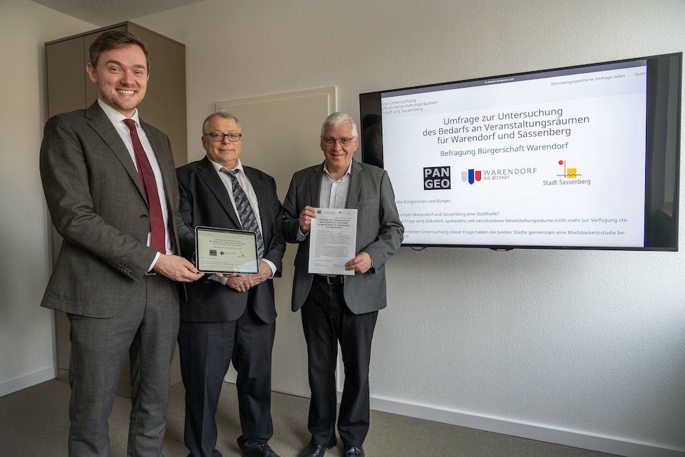 Den Auftrag für die Untersuchung hat das Planungsbüro PAN GEO Gesellschaft für Angewandte Geographie mbH aus Stuttgart erhalten. PAN GEO kann insbesondere im Bereich der Planung von Veranstaltungsimmobilien auf langjährige Erfahrung zugrückgreifen. Geschäftsführer Dr. Johannes Feifel konnte sich bereits in dieser Woche in Warendorf und Sassenberg mit den örtlichen Gegebenheiten vertraut machen. Im Austausch mit den Bürgermeistern Josef Uphoff (Sassenberg) und Peter Horstmann (Warendorf) wurde als nächster Schritt eine Befragung der Bürgerschaft beider Städte zu ihrem Veranstaltungsbedarf vereinbart.