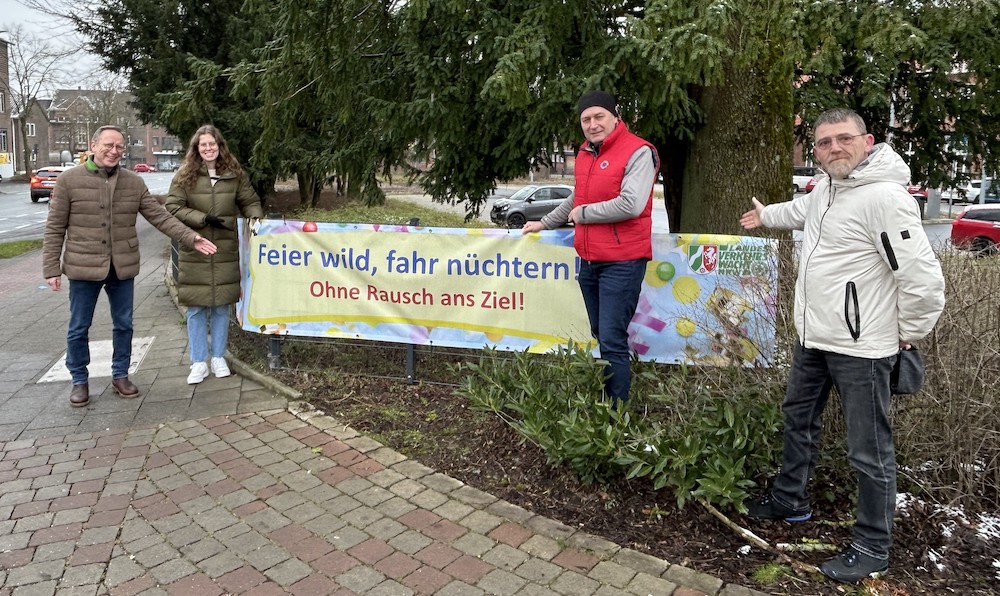 „Alkohol am Steuer ist eine Gefahr für alle. Und auch am Morgen danach ist Vorsicht geboten: Wer viel trinkt, hat auch Stunden später noch Restalkohol im Blut“, warnen Werner Schweck, Geschäftsführer der Verkehrswacht und Carolin Neuhaus, Mobilitätsmanagerin der Kreisverwaltung Warendorf. Beide hängten dazu gemeinsam mit Frank Buntrock, Stabsstelle Klimaschutz und Mobilität sowie Michael Göttferd, Ordnungsamtsleiter der Stadt Ahlen ein Banner mit der Aufschrift „Feier wild, fahr nüchtern!“ an einer zentralen Stelle im Stadtgebiet Ahlen auf.