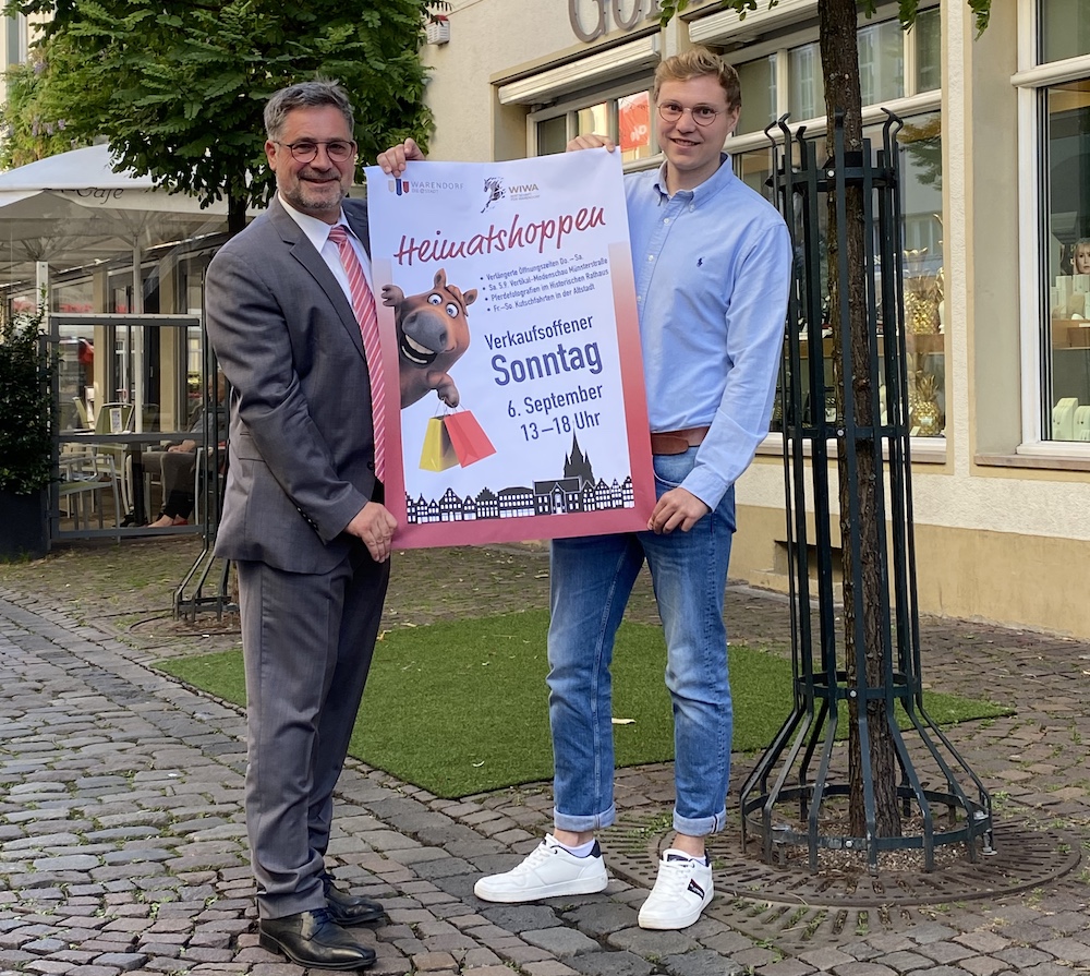 Den Einzelhandel haben die letzten Wochen und Monate hart getroffen. Durch den verkaufsoffenen Sonntag möchten wir unsere Einzelhändler vor Ort unterstützen“, erklärt Bürgermeister Axel Linke. Gemeinsam mit Thorsten Büttner, Sprecher der Innenstadt-Kaufleute, präsentierte er nun das Plakat, das für den Öffnungstag am ersten Septemberwochenende werben soll. „Ein kleines bisschen Werbung möchten wir schon für diesen verkaufsoffenen Sonntag machen“, so Büttner. „Da die Fiesta Championata ja leider ausfallen muss, möchten wir auf diesem Weg darauf aufmerksam machen, dass man am kommenden Sonntag dennoch in Warendorfs guter Stube shoppen kann.“