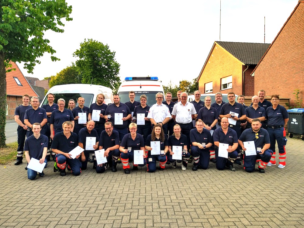 Bernd Köster, Leiter Einsatzdienste der Malteser in Warendorf, und Kreisbrandmeister Heinz-Jürgen Gottmann übergaben 32 Auszeichnungen an die anwesenden Helfer*innen aus Ahlen, Drensteinfurt, Ostbevern, Telgte und Warendorf. „Als Anerkennung für euren ehrenamtlichen Einsatz und eure Bereitschaft, eigene Belange hintenanzustellen und unverzüglich Hilfe zu leisten, überreiche ich Euch diese Auszeichnung“, so Köster.