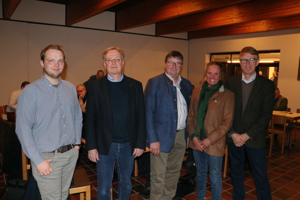 v.l. Felix Homann (Berufsjäger), Dr. Andreas Witte (Leiter Veterinäramt Kreis Warendorf), Josef Roxel (Vorsitzender der Kreisjägerschaft Warendorf), Claudia Böckenhüser (Vorstand Kreisjägerschaft) und Dr. Hubert Hemmis (Amtsveterinär Kreis Warendorf) informierten die gut 40 Jägerinnen und Jäger über die Gefahren der ASP und die Auswirkungen eines Seuchenausbruchs für die Landwirtschaft im Kreis.