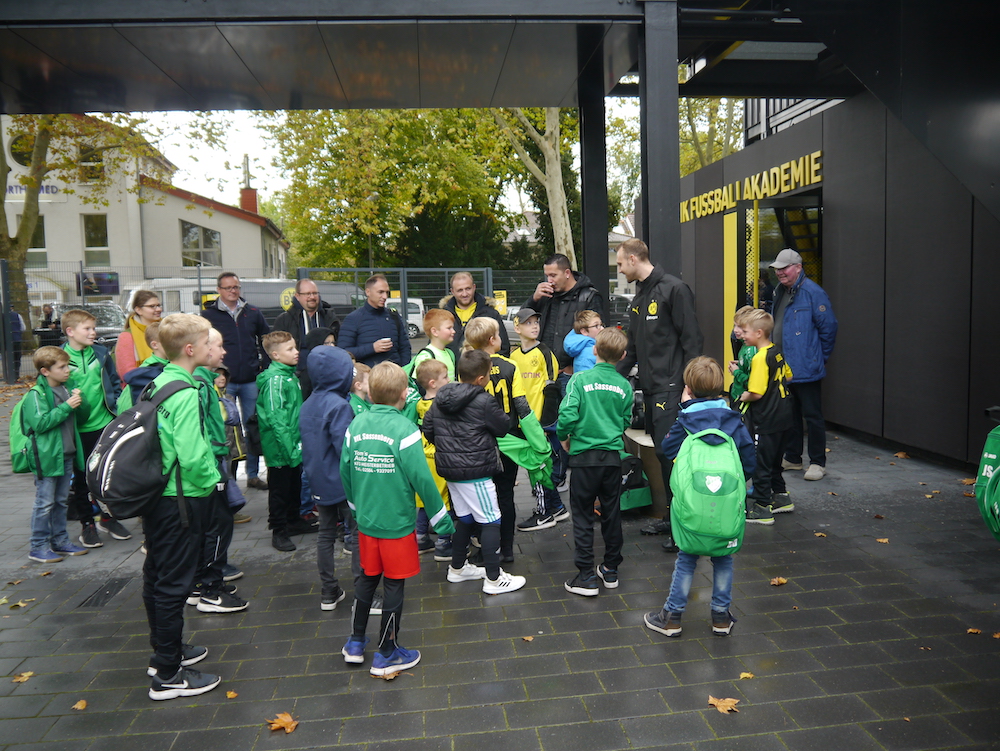 28 Kinder des VfL Sassenberg und deren Eltern fuhren zur BVB-Evonik-Fußballakademie an der Strobelallee ganz nah im Blickfeld des Signal Iduna Park. Im Empfang genommen wurden die Kinder vom Fußballtrainer und Manager der Akademie, Markus Pasdzior, der auch mit seinem Kollegen Torsten Sengteller die fast zweistündige Trainingseinheit einleitete. Eingeteilt in zwei Gruppen waren die üblichen fußballspezifischen Trainingsinhalte wie Dribbeln, Passspiel und Torschuss für den Trainings-Spaß der VfL-Nachwuchskicker verantwortlich.
