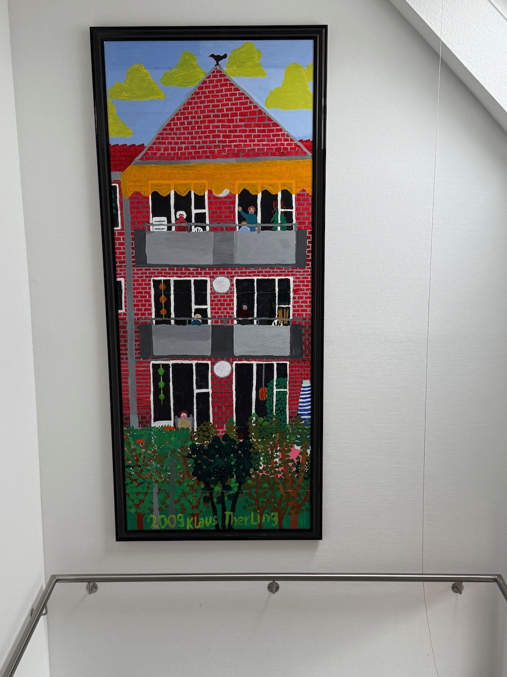 Neben ihm steht Sylvia Warthorst. Sie liebt es, klassische Mondgesichter an die Wand zu malen und bleibt bei diesem Motiv, das sie immer wieder abwandelt. Warthorst zählt ebenso wie Klaus Therling zu den ersten Mitgliedern der Vitusmaler. Beide haben schon mehrfach ausgestellt. Ein großflächiges Bild von Therling hängt zum Beispiel im Haus Vitus und stellt das Gebäude der Caritas-Einrichtung dar – inklusive seiner Bewohner, die zum Teil auf den Balkonen zu erkennen sind.