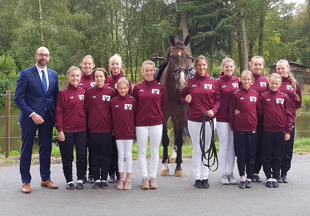 (von links: Stefan Hölzle Volksbank Warendorf, Emma Schräer, Nele Schulden, Lilo Erpenbeck, Liv Tegtmeyer, Finnja Koch, Marlen Lütke Hockenbeck, Pferd Sir Lano, Nadine Berkemeyer, Hannah Stapel, Inka Lieber, Neele Krewerth, Bea Rohde und Vivian Termeer)