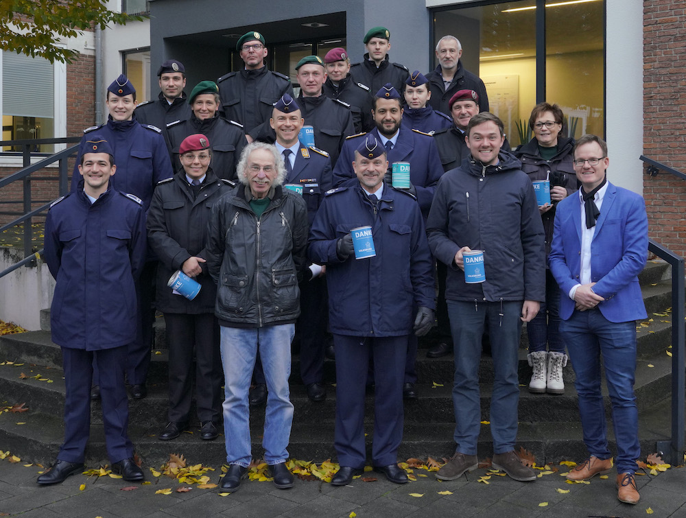 Die Straßensammlung wird in Warendorf traditionell unterstützt von der Stadt Warendorf und der Georg-Leber-Kaserne. So freute sich Bürgermeister Peter Horstmann an diesem Freitag, neben einer Abordnung der Georg-Leber-Kaserne unter Leitung von Oberst Rüdiger Jorasch, auch den Regionalgeschäftsführer des Volksbundes Jens Effkemann in der Stadtverwaltung begrüßen zu können. Im engen Zusammenhang mit der Arbeit des Volksbundes stehen die Gedenkfeiern zum Volkstrauertag. Dieses Gedenken wird in Warendorf und allen Ortsteilen mit Kranzniederlegungen, Ansprachen und Gedenkstunden abgehalten. Seit 2016 gibt es zusätzlich die von Bürgermeister a.D. Jochen Walter initiierte Veranstaltung „Lieder gegen den Krieg“ im Theater am Wall. Dabei finden sich Musiker aus der Region zusammen, die sich auf ganz individuelle Art mit musikalischen Botschaften gegen Kriege und für den Frieden positionieren. Am Ende der diesjährigen Veranstaltung kamen bei einer Spendensammlung unter den anwesenden Besucherinnen und Besuchern 1.175 € für die Arbeit des Volksbundes zusammen. Diese Spende konnten Jochen Walter und die Vorsitzende des Vereins Theater am Wall, Maria Rother, jetzt an Jens Effkemann, Regionalgeschäftsführer des VdK Westfalen Lippe, übergeben.