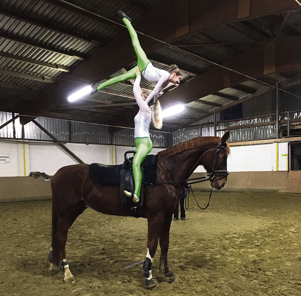 Die Kleinsten turnen auf den Rücken der Großen, die auf dem Pferderücken sitzen, knien oder stehen, herum und zögern nicht, sich in einer Rolle durch die Luft wirbeln zu lassen oder über den Köpfen der Partner in die Luft stemmen zu lassen. Klar, dass solche schwierigen Übungen nicht auf Anhieb klappen- aber dafür ist das Wintertraining ja da.
