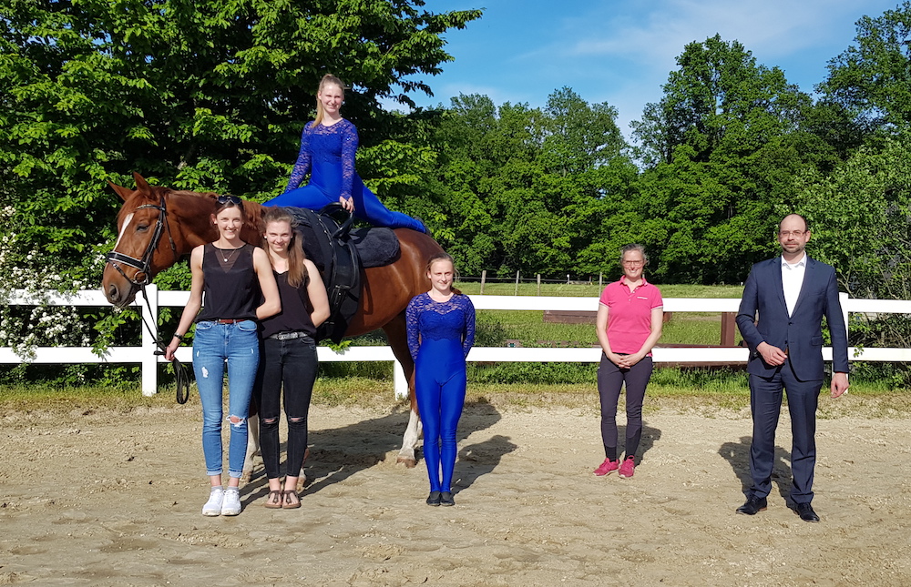 Auch wenn derzeit noch einige Vorgaben strengstens beachtet werden müssen und das Training noch nicht wieder dem vor dem Lockdown entspricht, ist man sich bei den Voltigierern einig, dass es nichts Schöneres gibt, als wieder vor Ort gemeinsam auf der Vereinsanlage zu trainieren. Davon konnte sich auch Stefan Hölzle von der Volksbank überzeugen, der der Einladung zu einem Besuch zum Training gerne folgte.