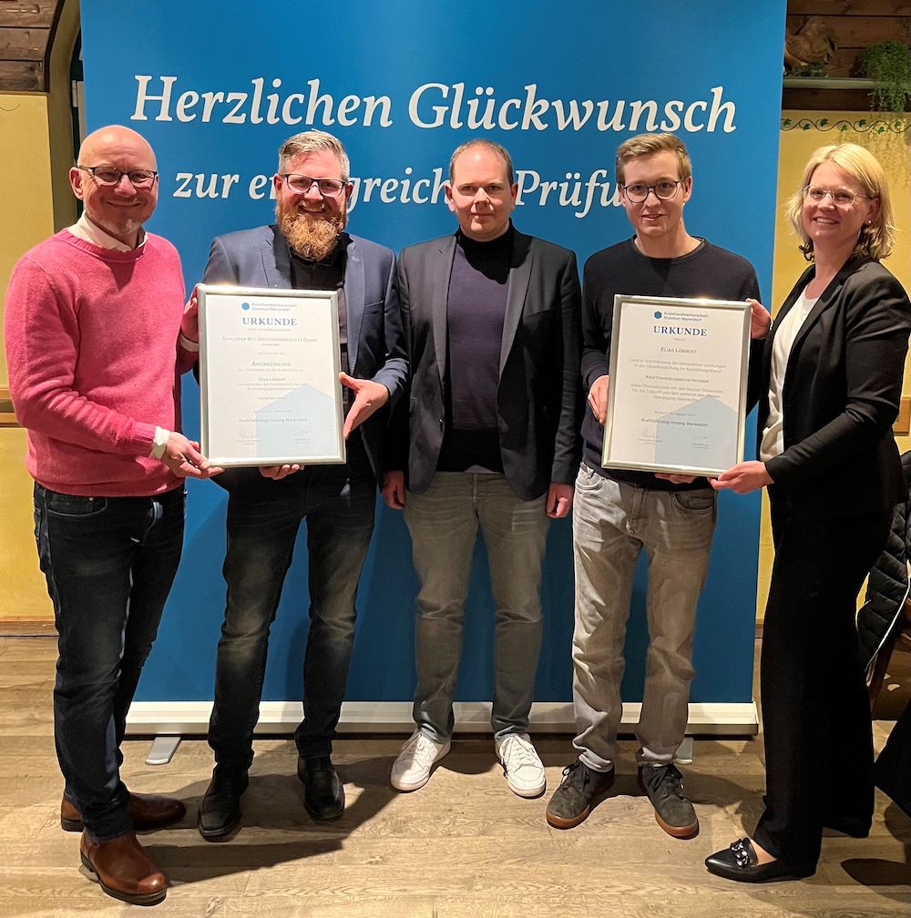 Als Innungsbestem gratulierten die Innungsvertreter sowie die Berufsschullehrer Norman Geisler (Berufskolleg Beckum) und Jörg Kreienkamp (Berufskolleg Warendorf) Elias Löbbert (Ausbildungsbetrieb Schlieper Kfz-Meisterwerkstatt GmbH, Wadersloh). Über ein Schülerpraktikum war Löbbert zum Kfz-Gewerbe gekommen. „Ich wollte als Neuntklässler an einem Auto herumschrauben und habe bei Schlieper gefragt, ob ich Werkzeug und Ersatzteile bekommen könnte“, erinnert er sich. Eine Bitte, die Christian Schlieper gerne gewährte: Unter Aufsicht durfte Elias Löbbert auch die Hebebühne im Betrieb nutzen, absolvierte später sein Schülerpraktikum im Betrieb, schloss den Ausbildungsvertrag und sammelt nun nach der erfolgreichen Gesellenprüfung weitere Arbeitserfahrung in der Wadersloher Meisterwerkstatt.