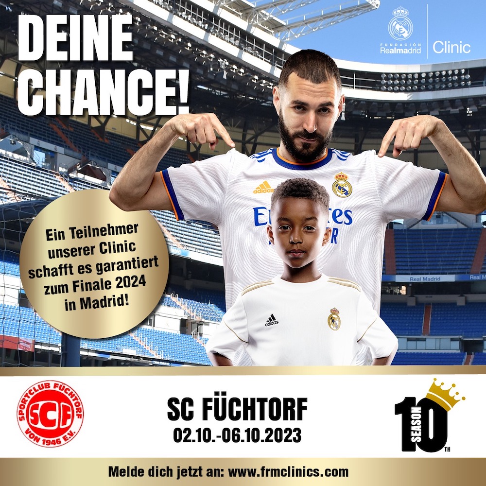 Vom 02.10.2023 bis zum 06.10. 2023 hat der SC Füchtorf königlichen Besuch! Die Fundación Real Madrid Clinic setzt gemeinsam mit dem SC Füchtorf ein 5-Tages-Fußballcamp um – und das schon zum 7. Mal im Spargeldorf. Die Teilnehmer können sich auf ein professionelles Trainingskonzept basierend auf der Philosophie der Real Madrid Jugendakademie sowie auf innovative Trainingsmethoden und – technologien freuen. Zudem liefert die Veranstaltung eine weitere Besonderheit: Mindestens ein Teilnehmer der Clinic erfüllt sich einen großen Traum: Der Clinic-Sieger, der sowohl durch sportliches Talent als auch soziales Auftreten überzeugt, nimmt garantiert am FRMC-Finale 2024 in Madrid teil! Und das, weil sich die ersten 50 Teilnehmer bis zum 31. Januar angemeldet haben. Das zeigt den Verantwortlichen des SC Füchtorfs wieder einmal, dass es die richtige Entscheidung war, die Veranstaltung zum 7. Mal auszutragen. Anmelden können sich die Jungen und Mädchen im Alter von 7 – 16 Jahren noch bis etwa 4 Wochen vor Campbeginn. Die Formulare dazu können auf der Homepage des SC Füchtorf unter www.sc-fuechtorf.de ausgefüllt werden. Sollten noch Fragen offen sein, können diese dem Organisator und Jugendobmann des SC Füchtorfs – Daniel Kuhlmann – unter der Mailadresse: daniel.kuhlmann@sc-fuechtorf.de gerne gestellt werden.