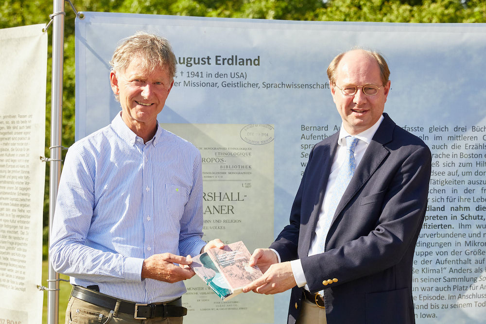 Landrat Dr. Olaf Gericke ließ sich auf dem Kulturgut Haus Nottbeck ausführlich über Leben und Schaffen Erdlands informieren. Anlass war die dort gezeigte aktuelle Ausstellung „Die Welt in der Tasche. Expeditionen ins Ungewisse“, in deren Zusammenhang die Wiederentdeckung Erdlands stattfand: „Es ist doch immer wieder überraschend, welche literarischen Schätze, zumal aus Westfalen, auch heute noch gehoben werden können“, so Gericke. Museumsleiter Prof. Walter Gödden betonte Erdlands literarische Ader: „Der Mann konnte wahrlich mit der Feder umgehen, zugleich bereichern seine Ausführung die aktuellen kritischen Debatten über die deutsche Kolonialgeschichte.“