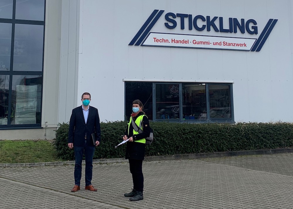 Projektberaterin Eva Lüning und Fertigungsingenieur Simon Gawer von der Franz Stickling GmbH tauschten sich im Rahmen des Projektes „KlimaSicher“ darüber aus, wie sich das Unternehmen gegen mögliche Klimafolgen rüsten kann.