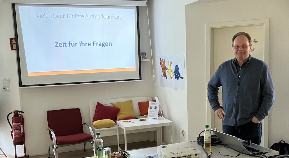 Insbesondere bei Kindern mit komplexen Schmerzen ist die Behandlung eine große Herausforderung und erfordert Erfahrung und interdisziplinären Austausch. In diesem Zusammenhang betonte Dr. Krüger, wie wichtig menschliche Zuwendung bei Schmerzen ist. Er verwies auf die besondere Bedeutung, die den ehrenamtlichen BegleiterInnen erkrankter Kinder zukommt, da sie die Möglichkeit haben, den Kindern ungeteilte Aufmerksamkeit sowie Zuwendung zu schenken. Im Anschluss an den Vortrag beantwortete Dr. Krüger die Fragen der ZuhörerInnen.