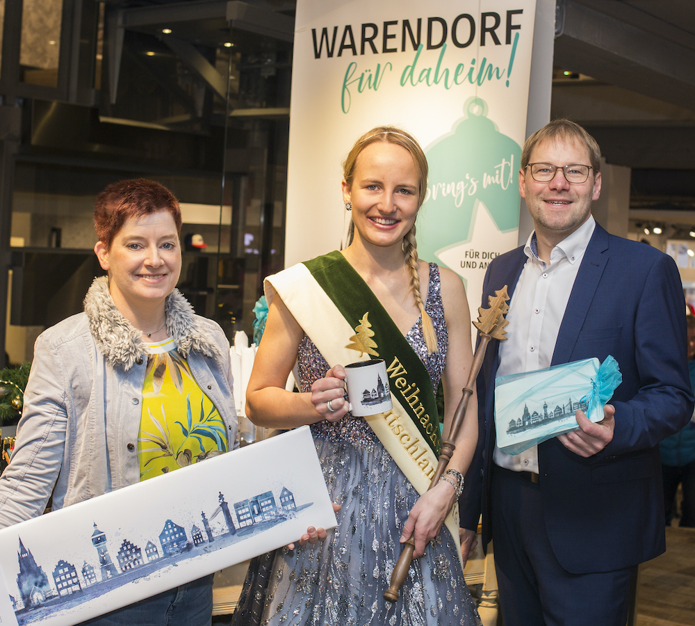 Cornelia Köster (Pilotfisch), Laura Stegemann (deutsche Weihnachtsbaumkönigin) und Christoph Berger (Modehaus ebbers) mit den Geschenkartikeln aus der Collection „Warendorf für Daheim“