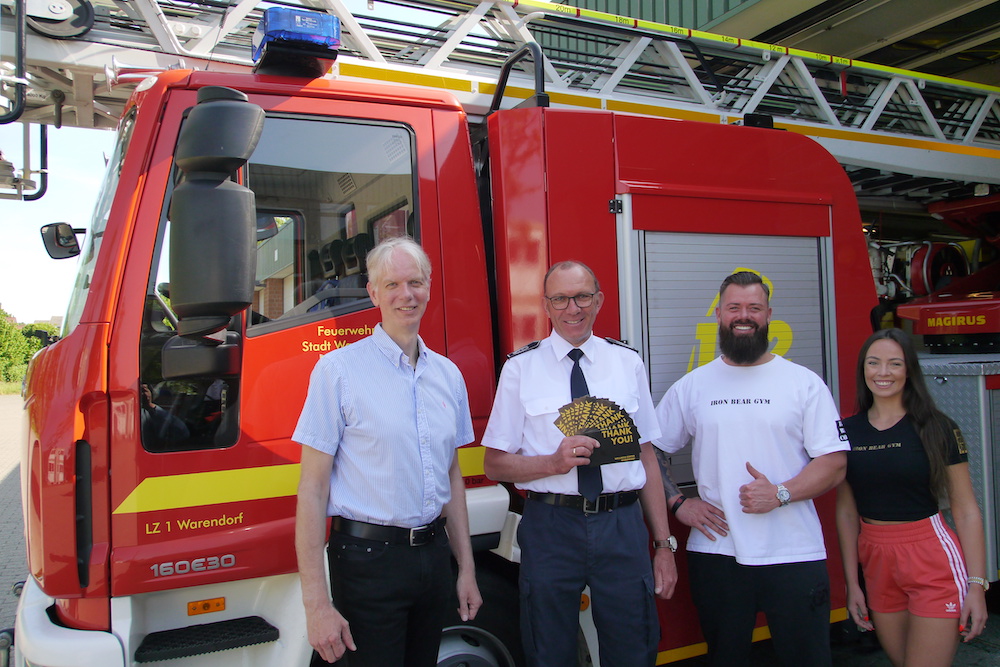 Der Gesamtbetrag von 6.000 Euro setzt sich aus Spenden zusammen, die von verschiedenen Firmen und Einzelpersonen an das Forum Regional Digital gegeben wurden. Das wiederum kaufte bei Klaus Fot und Angelina Semke vom Iron Bear Gym und Wellness Center Warendorf 600 Gutscheine, die jetzt der Feuerwehr zur Verfügung gestellt wurden.
